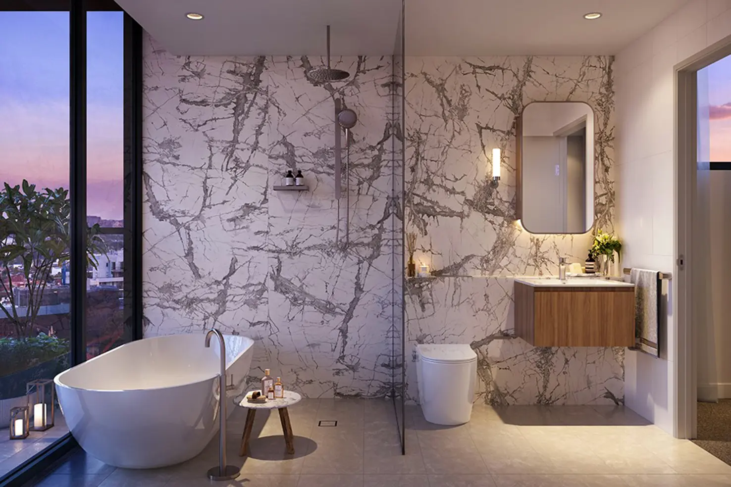 The bathrooms are enhanced by a dramatic feature wall in marble inspired tiles. The clean, uncluttered spaces feature wall-hung vanities with joinery in an oak finish and chrome hardware for a contemporary edge, along with the luxury of a freestanding bath.